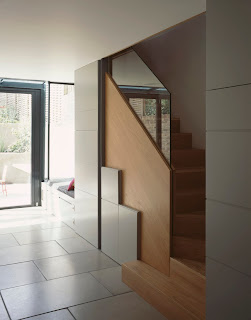 Suspended storage concealed over 1/2-landing (behind painted vertical timber wall paneling) |