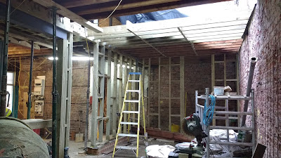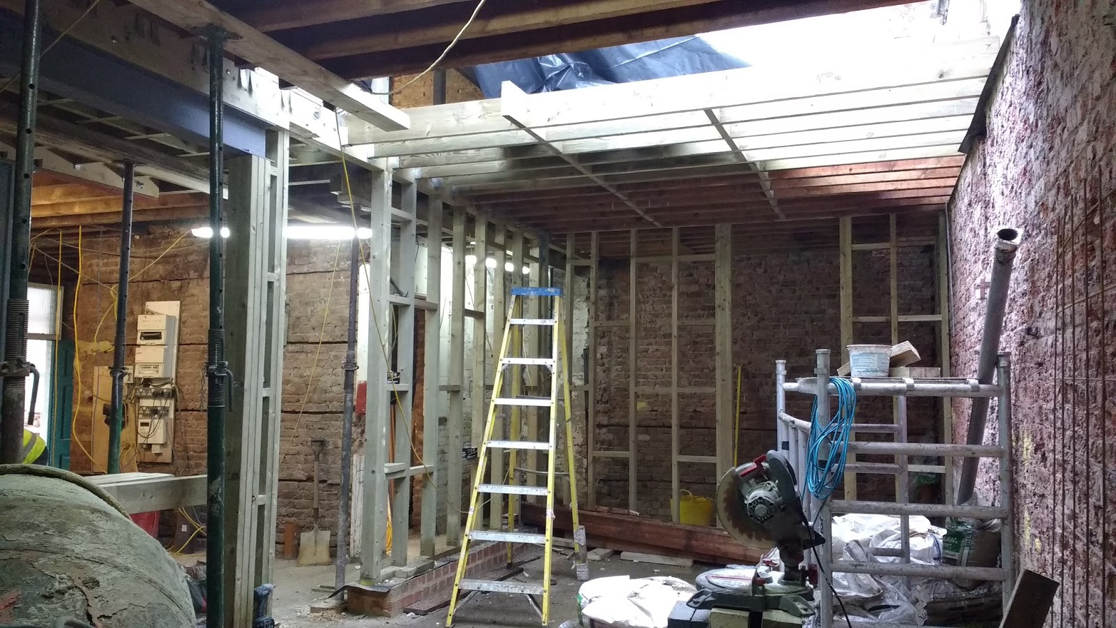 while works on the First Floor have created a large open space, the structural walls at the ground floor were removed and temporary props held up the floor above until they have been replaced by new timber construction and steelwork.