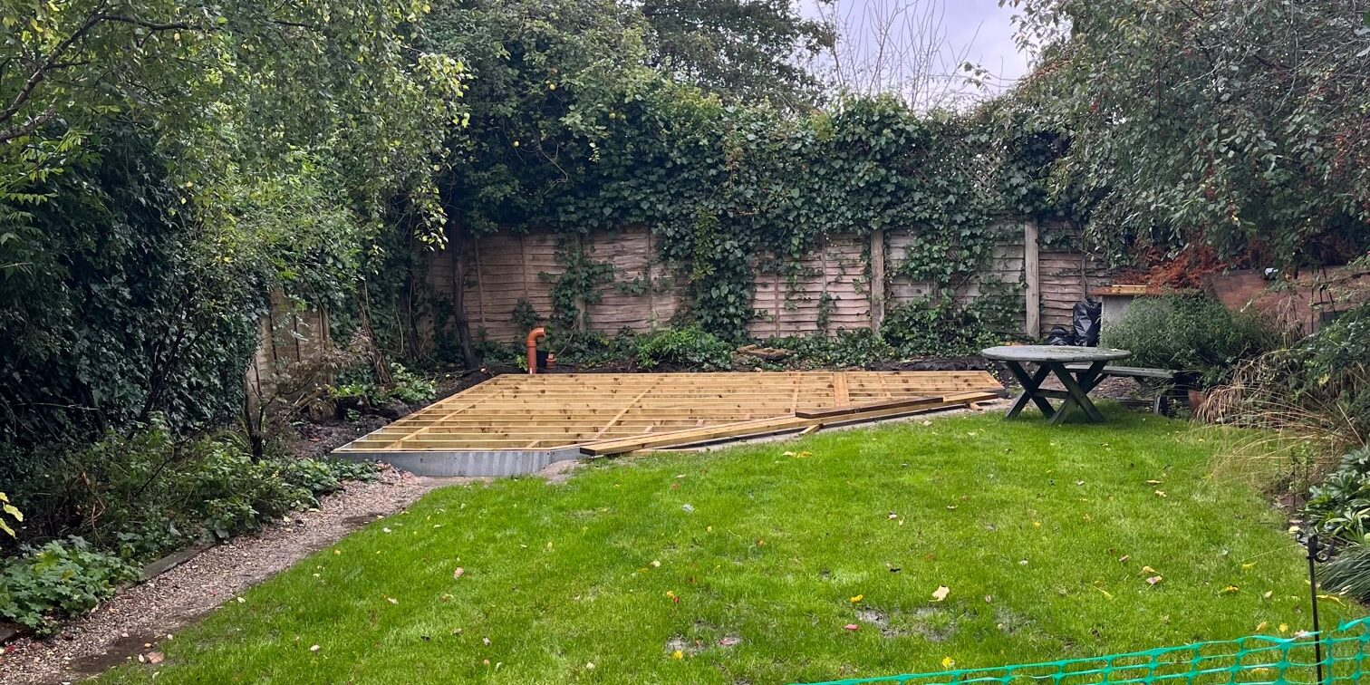 How nice to see our new pavilion emerging so neatly in the garden of a Grade ll listed house in Highgate. Its timber-framed base, sitting lightly just above the surrounding lawn on the network of screw piles driven into the soil beneath, quietly awaits the incoming wall and roof studs. Low embodied carbon construction with minimum impact on the environment.