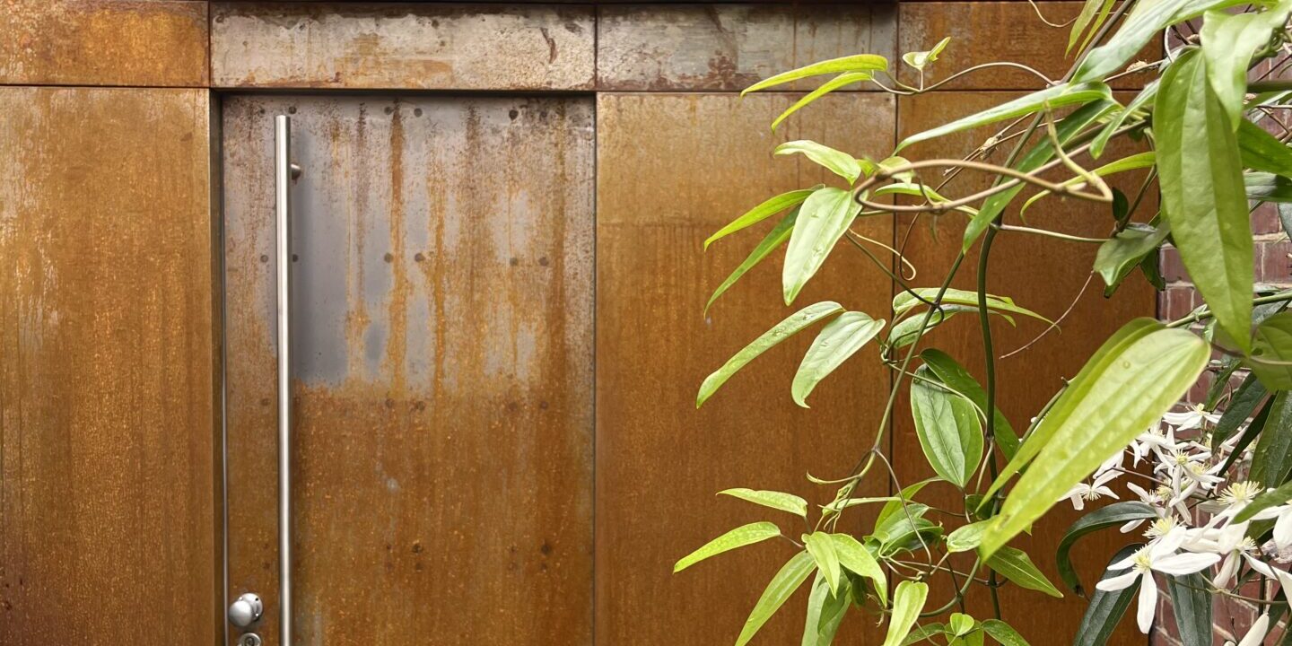 This weathering steel cloak installed this Winter is slowly evolving into its first Spring. The patina continues to mature nicely. The hoarding facing the street continues to shield it from the views of passers by until the process is complete.