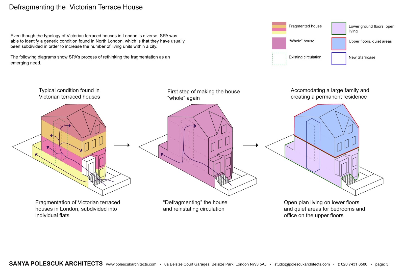 We focused on three Victorian terrace houses that have been radically transformed to accommodate a growing population of large families and people who work from home. Sub-dividing these houses into flats was a typical practice in the late 20th century, but in recent years there has been a high demand to transform these modified buildings back into single-family dwellings.