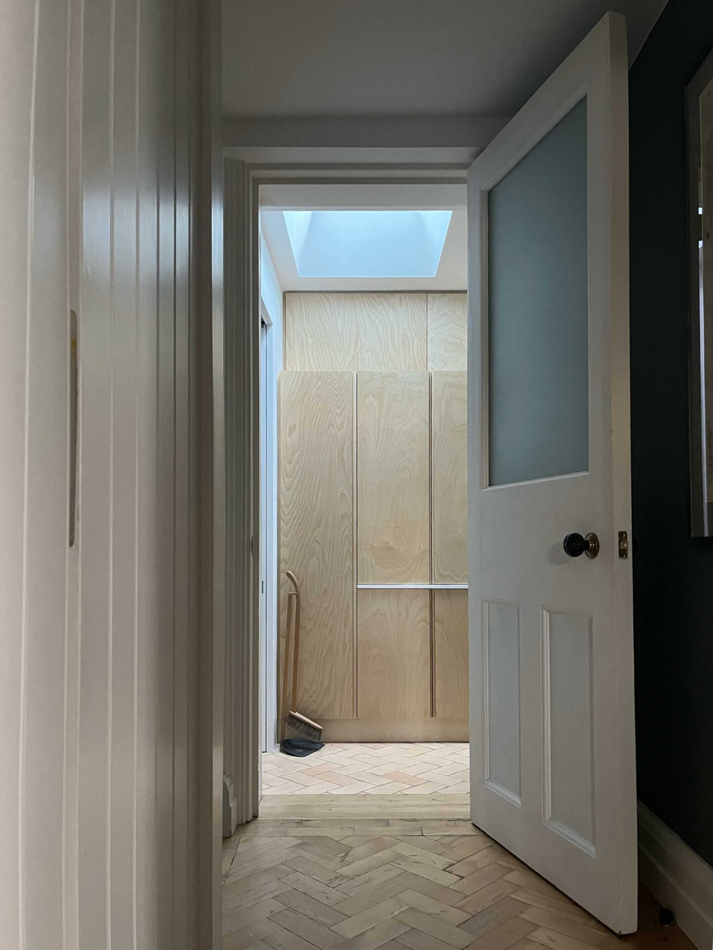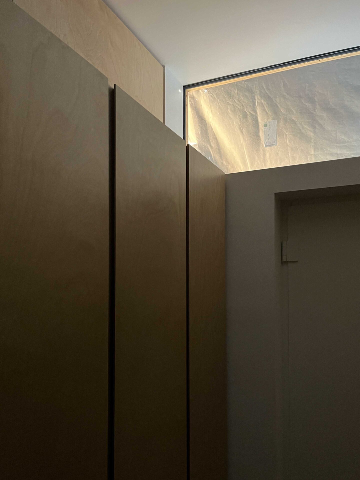 The finishing touches come together, with the beauty of sunlight entering through the external protection, casting light on the finely executed ply joinery.