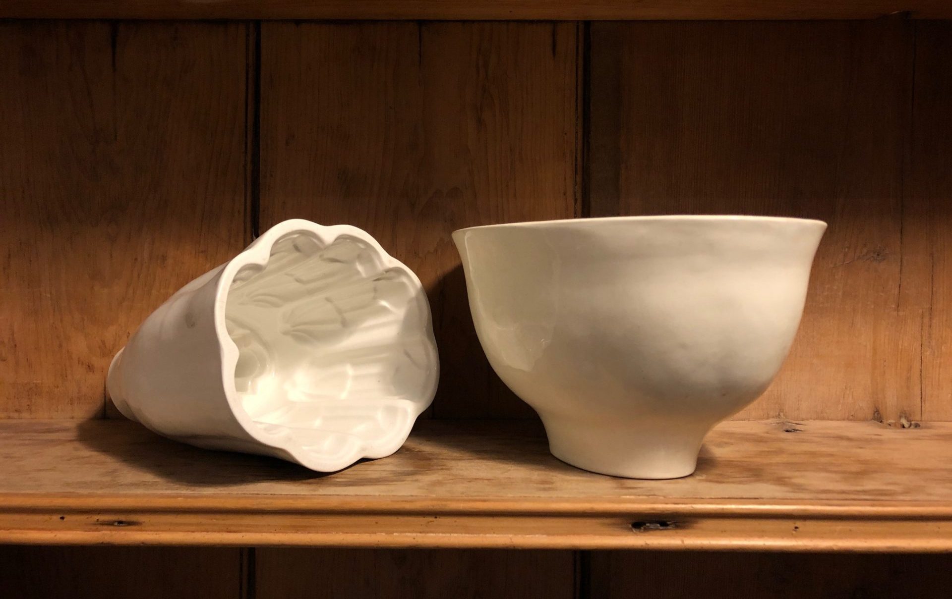 Beautiful reflections of light and shade on the bodies of these jelly moulds, like some vases or crinolines missing their torso, as if lined up in a shop window but with the ultimate surprises inside.