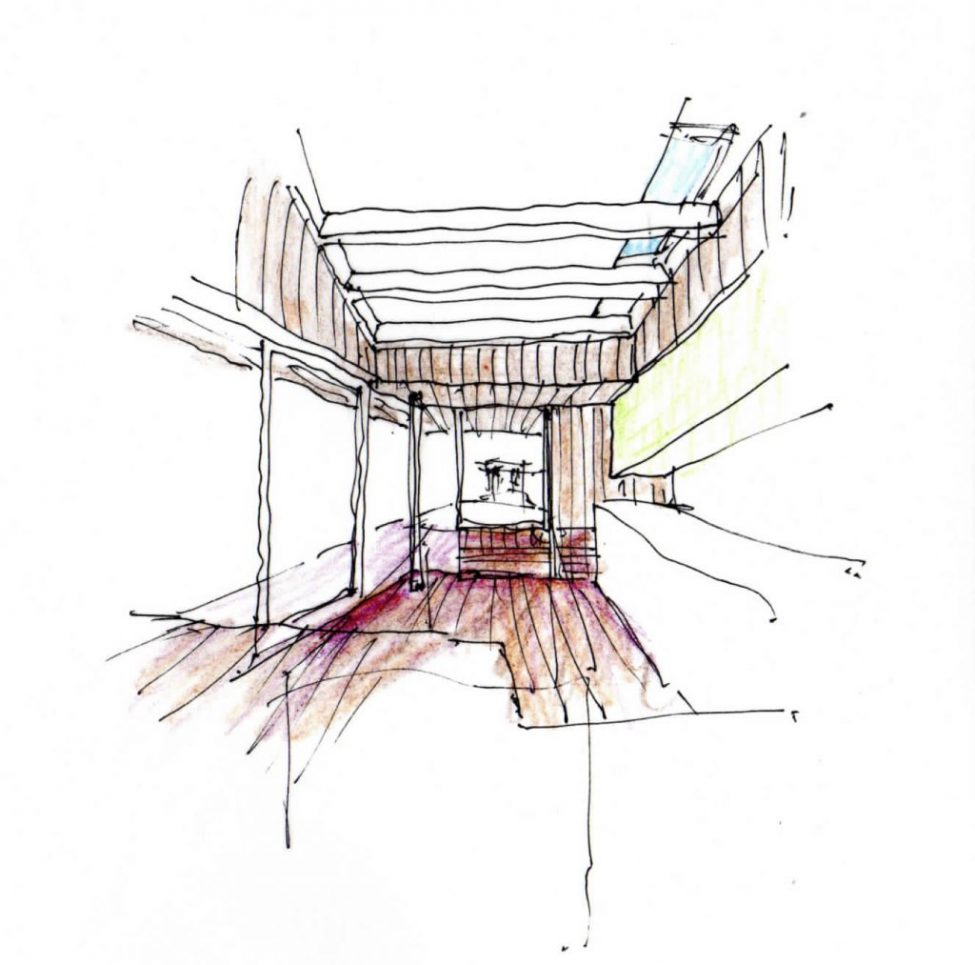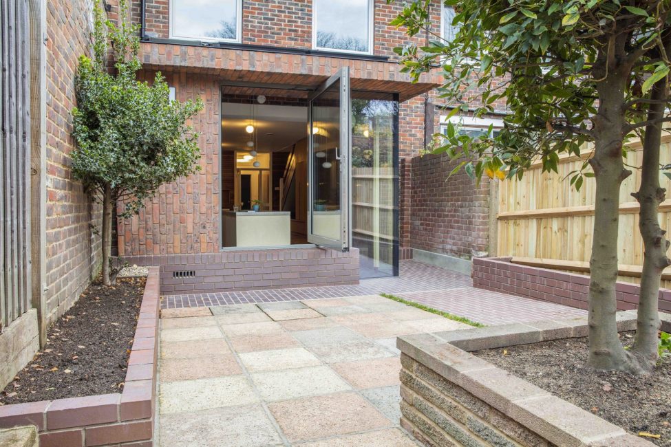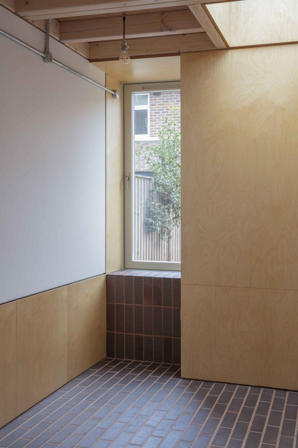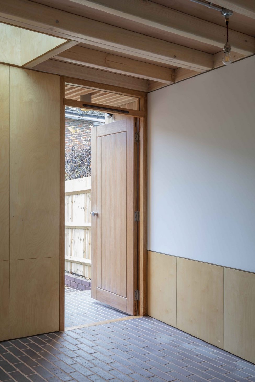 Originally a small, street-facing kitchen looked out onto a large road junction. This space has been repurposed as a home for a combination of water cylinder, utility and bicycle storage. The new kitchen is now the heart of the home, located in a pivotal point between the rear garden and the living space. The timber structure is left exposed and the weighty, south-facing brick extension is hung lightly. The large pivot window frames the statuesque bay tree in the centre of the garden. Unfashionable pavers and concrete bricks, saved from the skip are relaid in a new composition leading towards a small, timber-clad garden studio. Although designed pre-pandemic the home-working environment has immediately come of age, allowing separate work space in a calm but textural space with exposed timber structure and a carpet of bricks leading all the way from the kitchen.