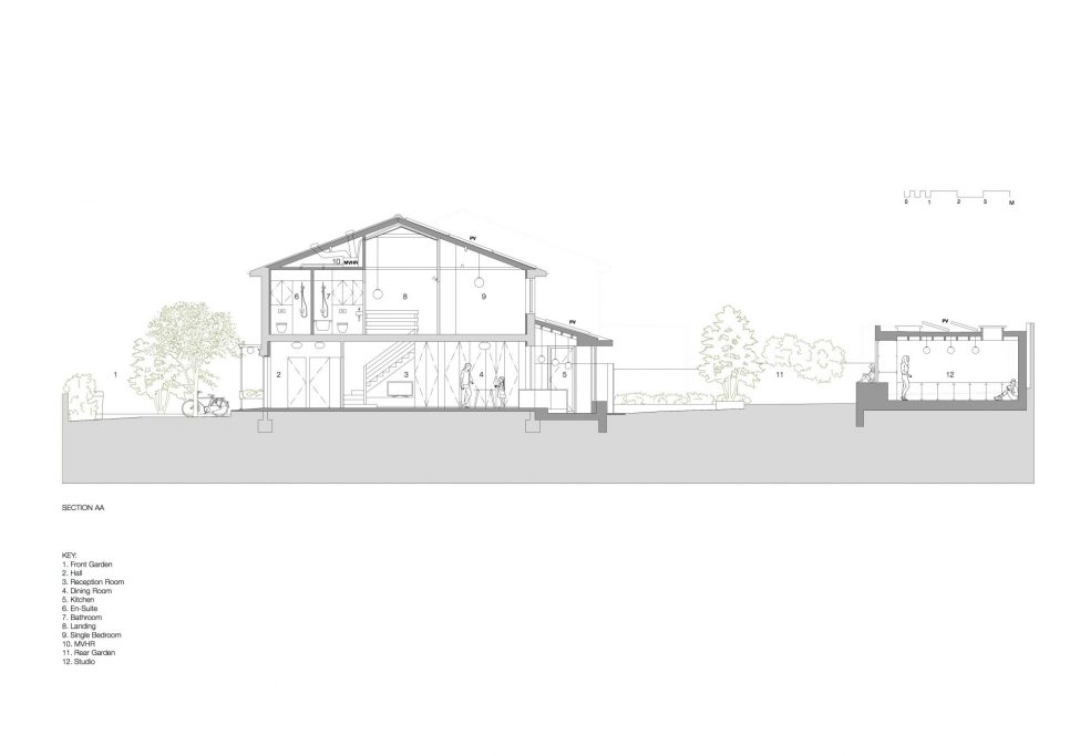 Fabric-first approach was used as a refurbishment method. This meant improving thermal properties of the external walls, roofs and ground floor and eliminating drafts. The cavity walls were filled with blown insulation and further upgraded with internal insulation. All wall vents were retained externally but blocked internally. New Mechanical Ventilation with Heat Recovery (MVHR) was installed instead in order to make for a warm, comfortable environment and much reduced energy demand. Instead of a gas-powered boiler, an air source heat pump (ASHP), coupled with PV and solar-thermal roof panels provides heat and hot water.