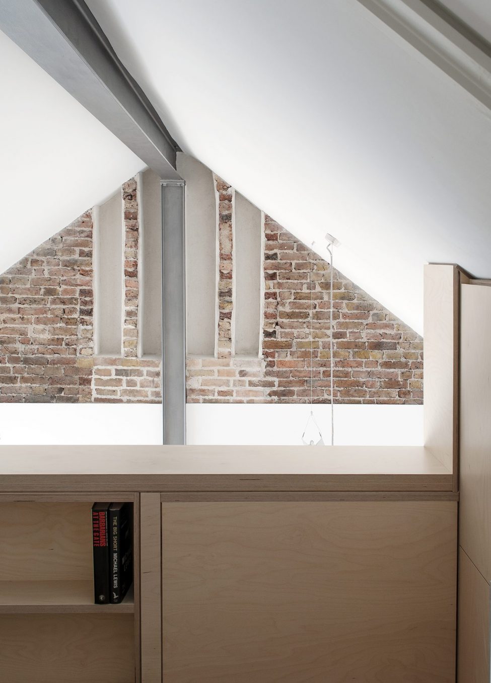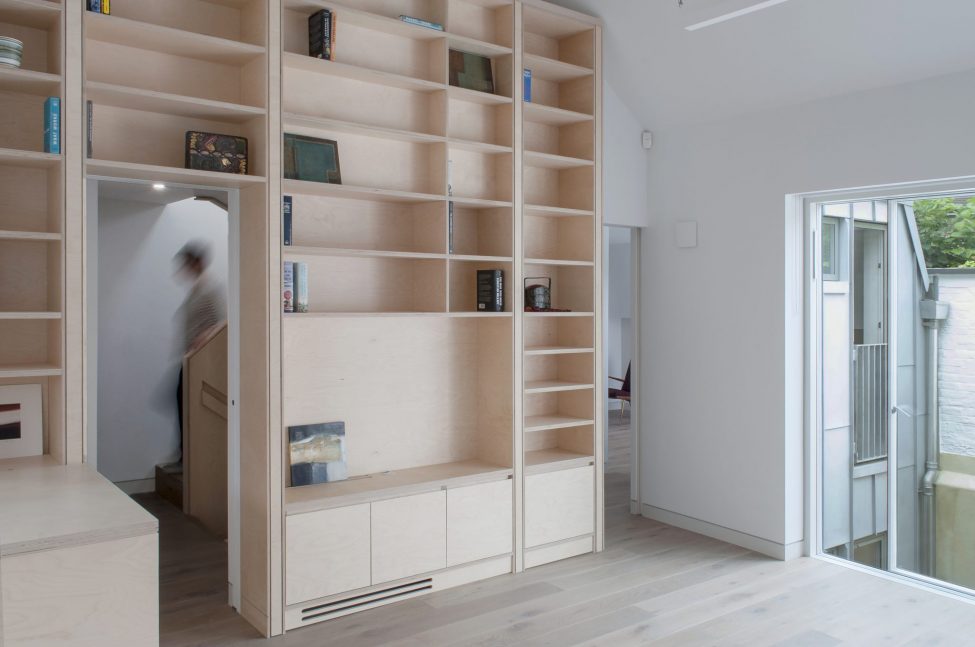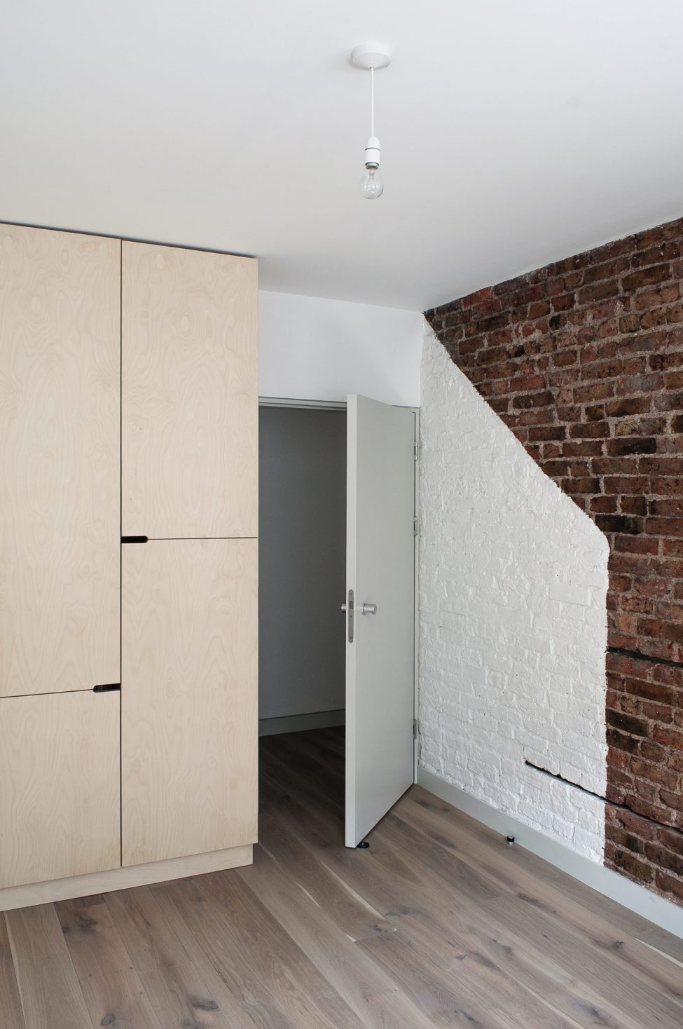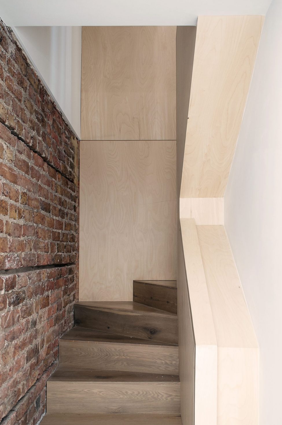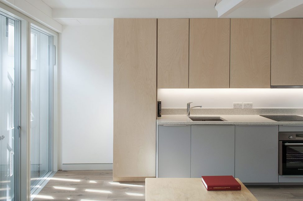 The two bright flats combine the calm tones of birch ply fitted joinery with the rawness of exposed brickwork and steelwork. Both flats enjoy private outdoors at the back of the house, adding to the graceful living within.