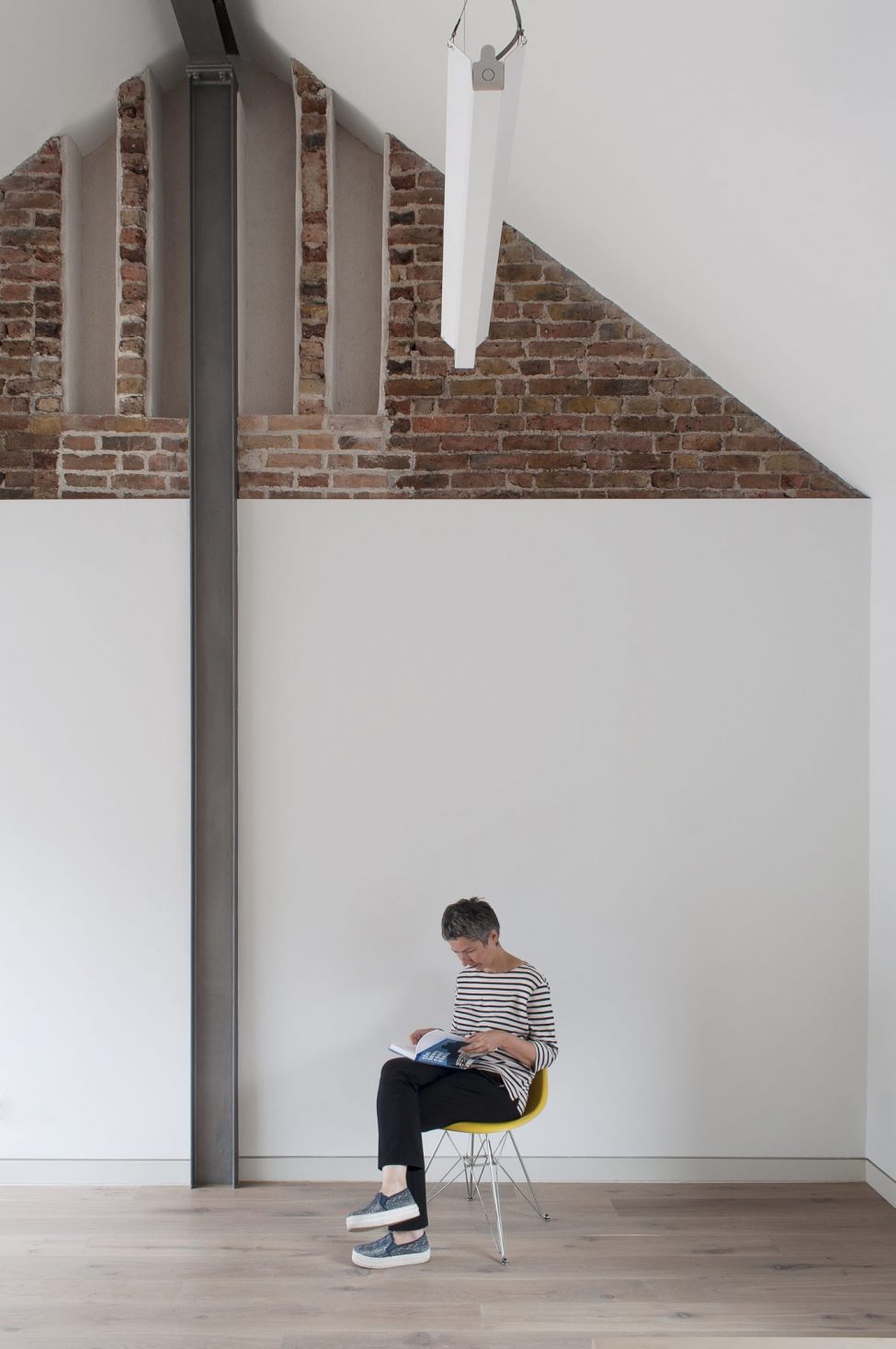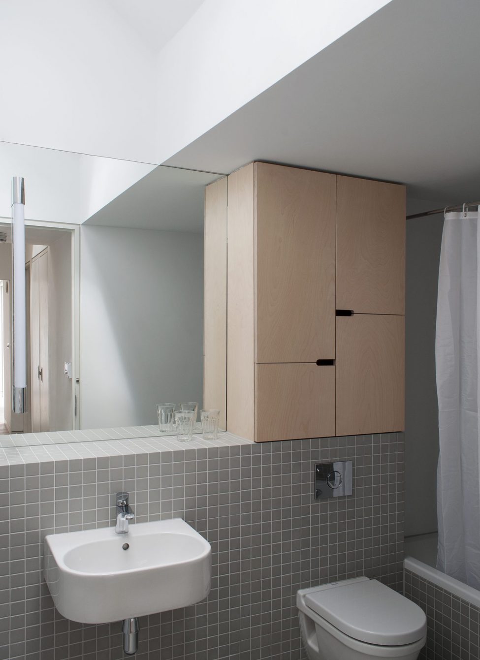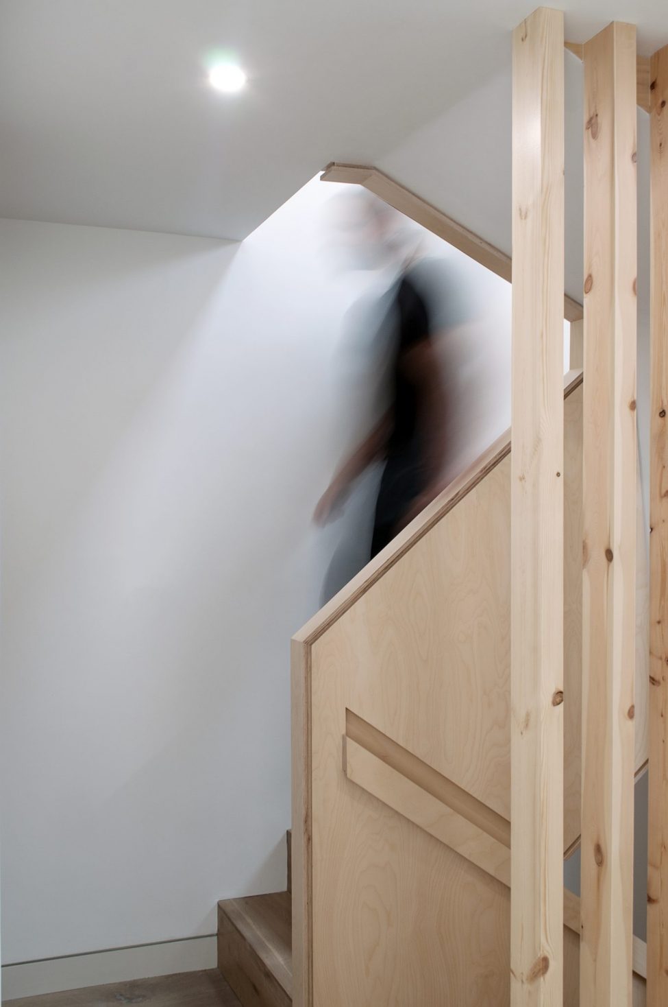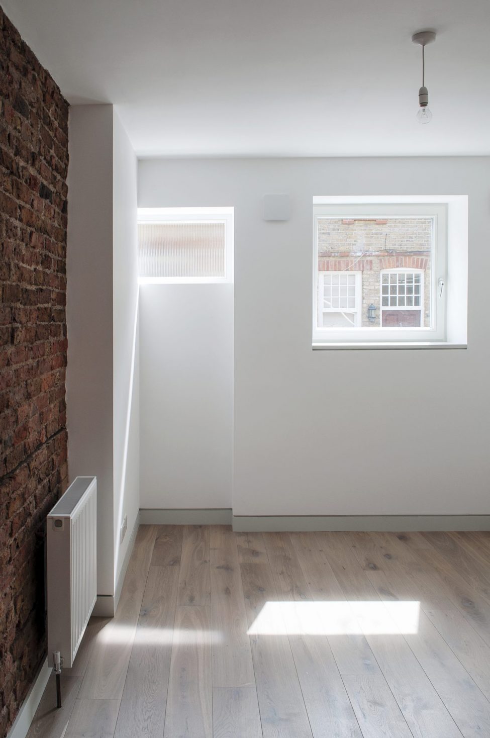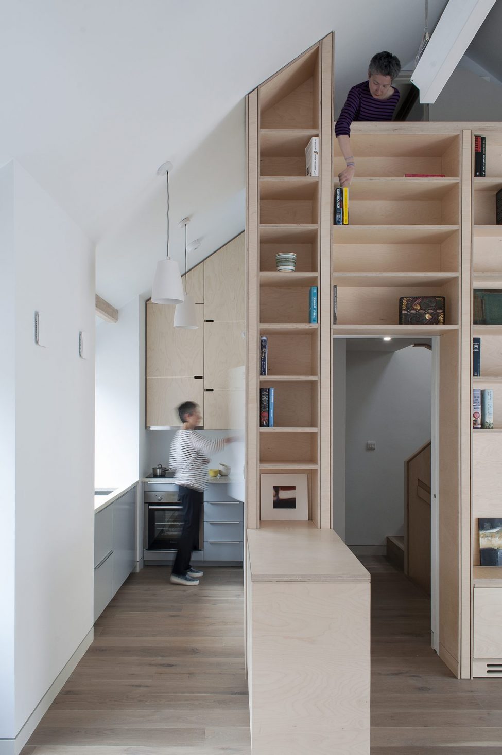 The two bright flats combine the calm tones of birch ply fitted joinery with the rawness of exposed brickwork and steelwork. Both flats enjoy private outdoors at the back of the house, adding to the graceful living within.