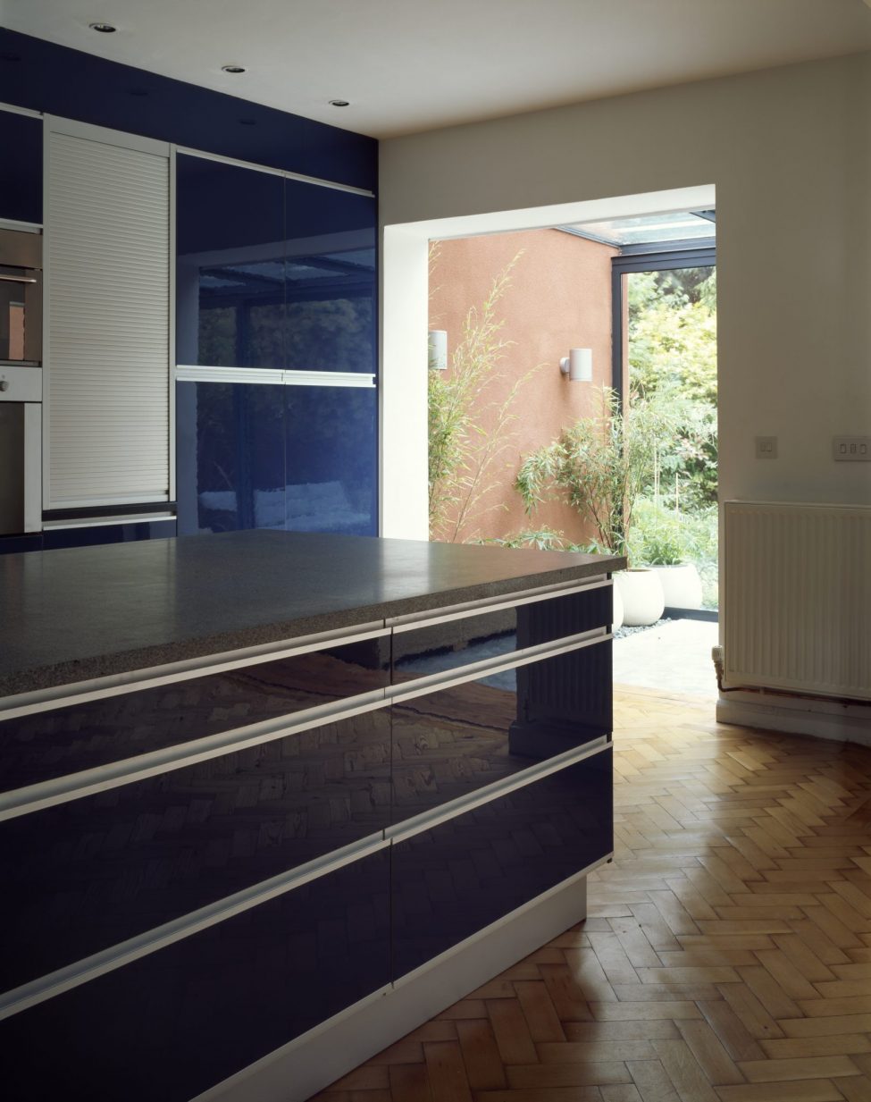 The ‘Cartesian’ garden room extension juxtaposes heavy mass elements – concrete, masonry & self-coloured render – against the more visually lightweight materials of glass & steel. The indoor room reaches out through a polished concrete floor that doubles as an outdoor terrace; indoor planting brings the garden inside.