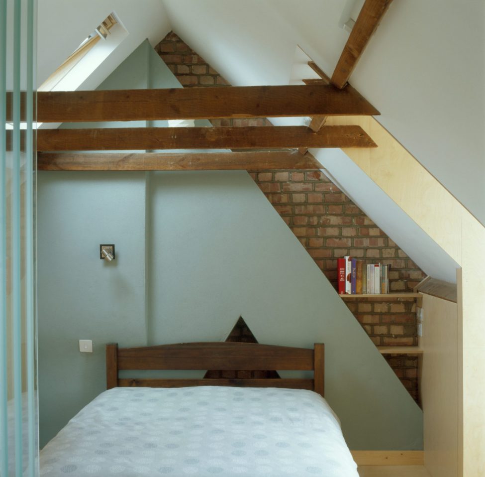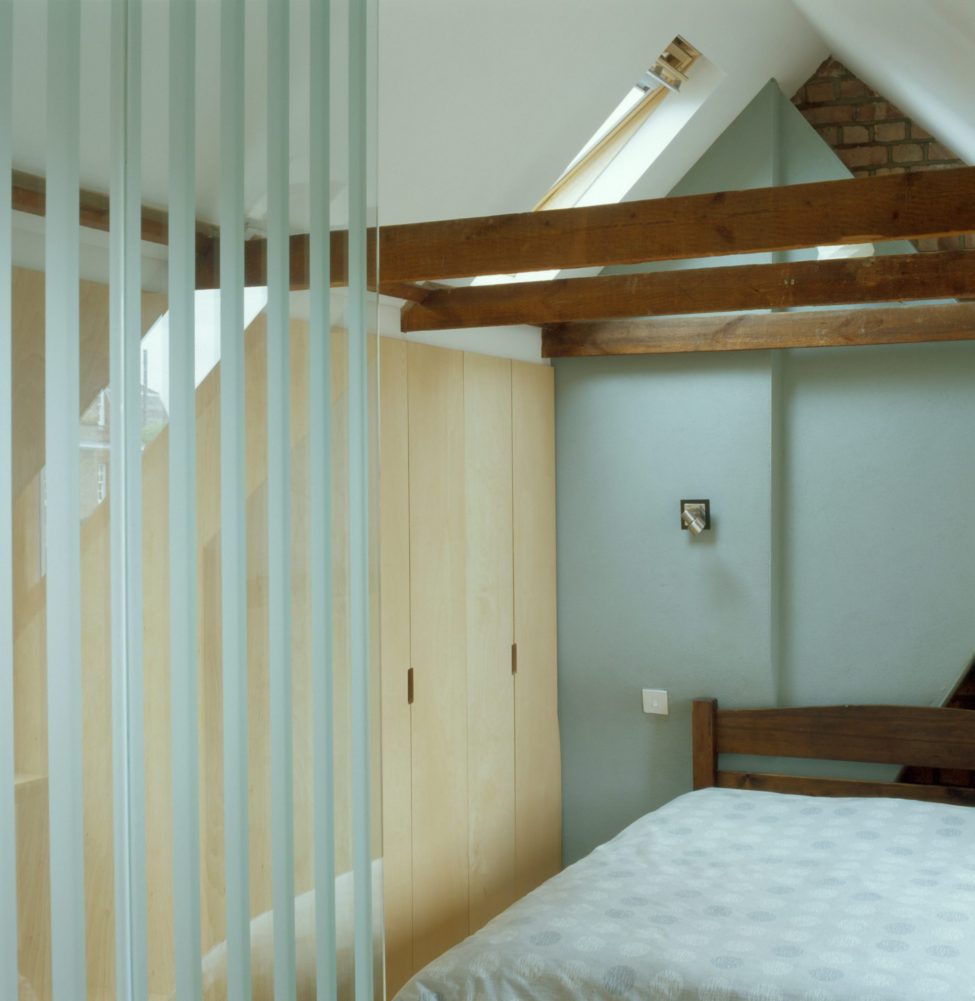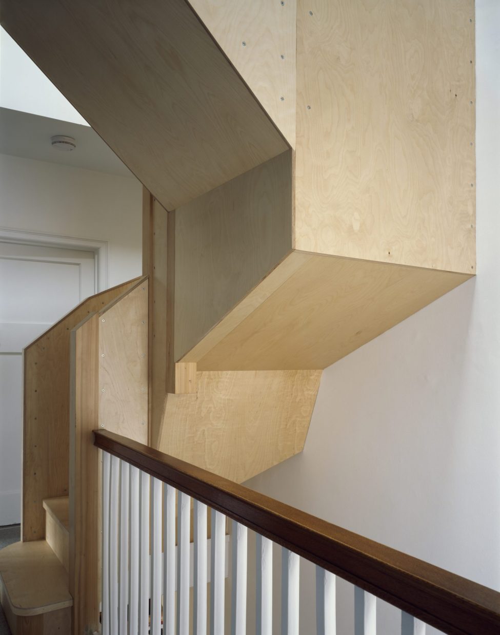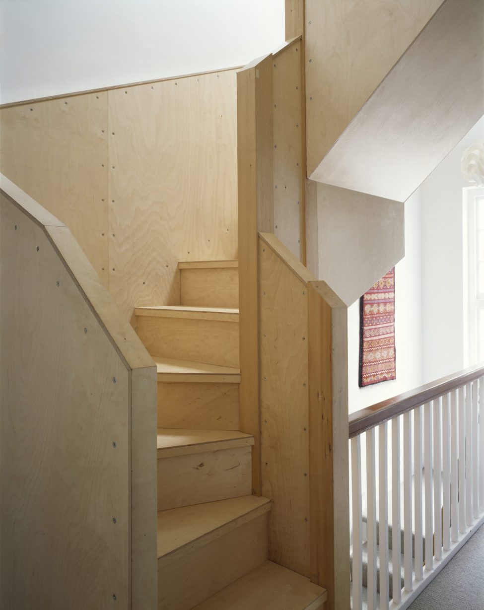A ply staircase leads to a sunlit loft conversion of a bedroom & en suite. With new dormers not permitted, the stair is carefully shaped into the existing roof’s apex, resulting in a quirky, upward folding object. Birch ply provides a calm, warm space, and serves the structural requirements for new ‘deep beams’ & floor strengthening.