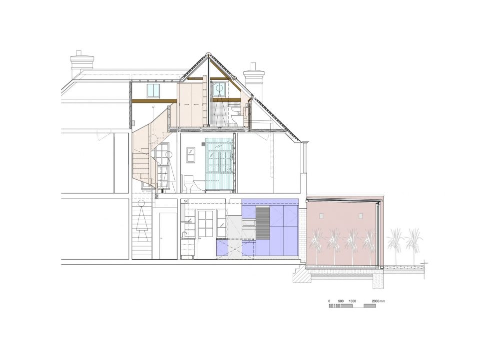 This modern redevelopment of a 1930’s Edwardian semi consists of a ‘rough and ready’ loft conversion in birch ply and a serene Cartesian rear garden room of glass, steel, & concrete.