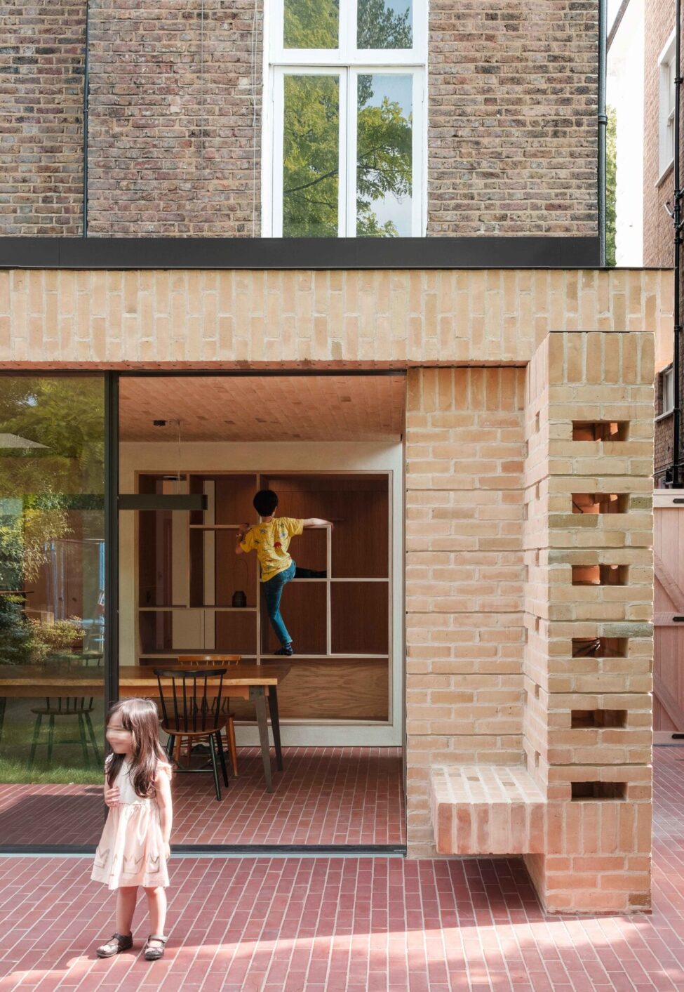 Serendipitously, the entrance hall revealed a brick barrel vault which, once cleaned, lime-washed and illuminated, created a cohesive theme straight from the front door. To avoid overheating, the south-facing extension is brick and not glass built. Setting the extension apart from the original host building, the new brickwork, two shades lighter than the original, contains about 10% of overburnt green glazed faces. Glass is used sparingly, only to help connect to the host building or to let the light in strategically. Slim clerestory windows let beams of light in from under the contradicting weight of the heavy brick ceiling above. Brickwork frames the view of the garden from above and underfoot. When all three slim-framed glazed doors between the extension and the garden slide away and stack up externally, the red brick floor leads, in an effortless transition, from indoor to outdoor.