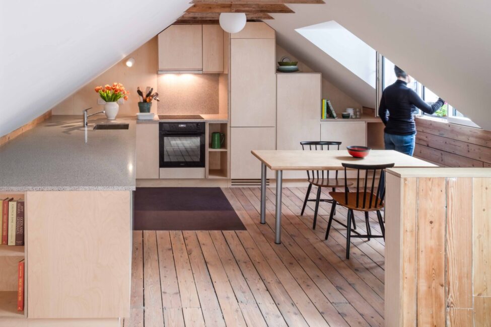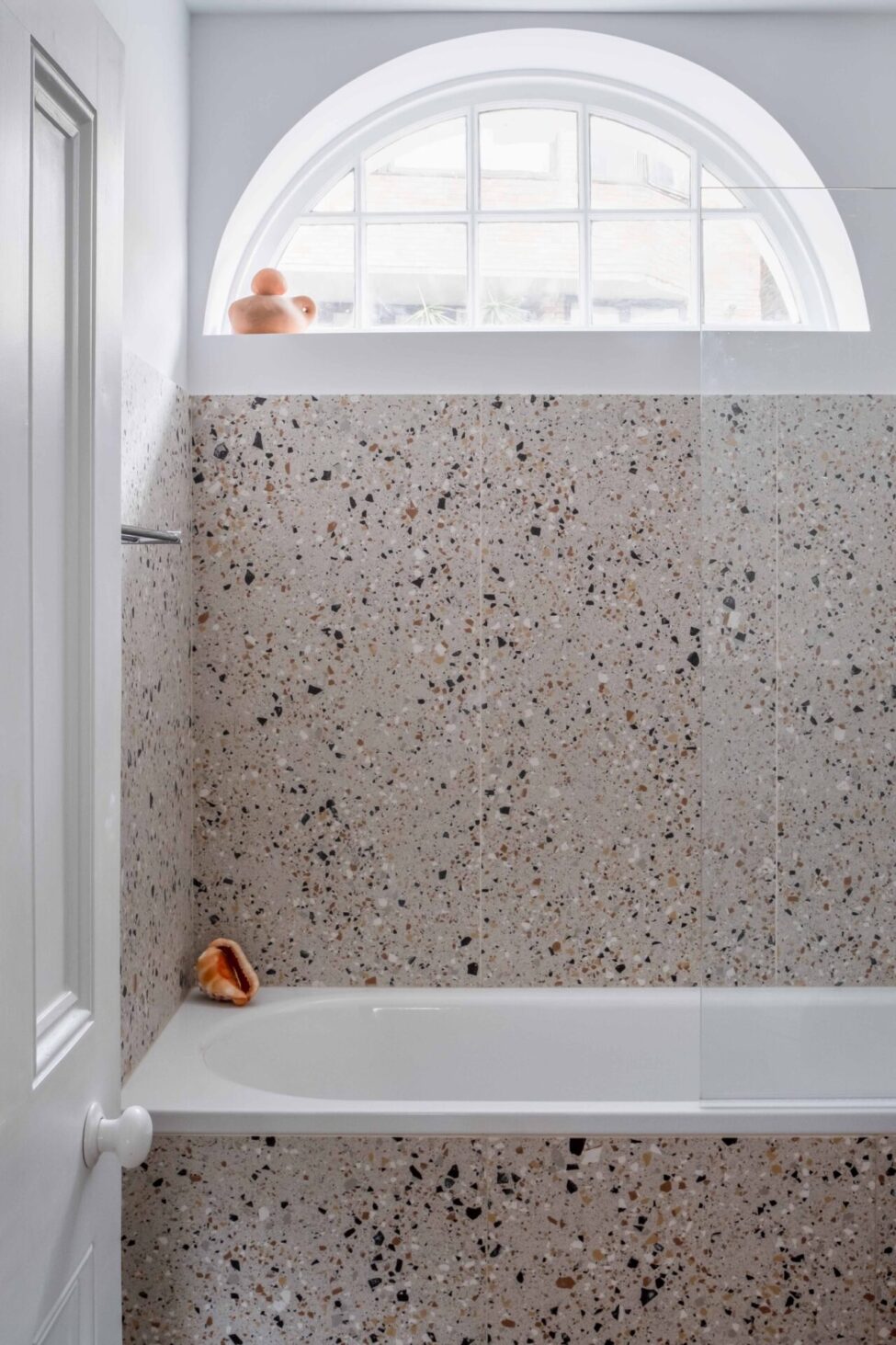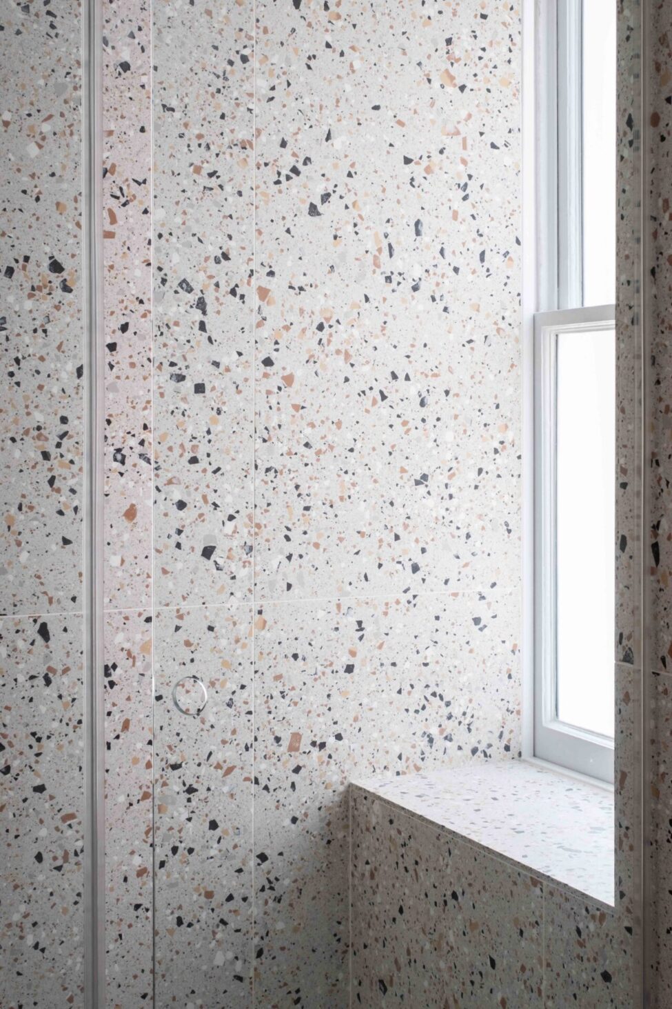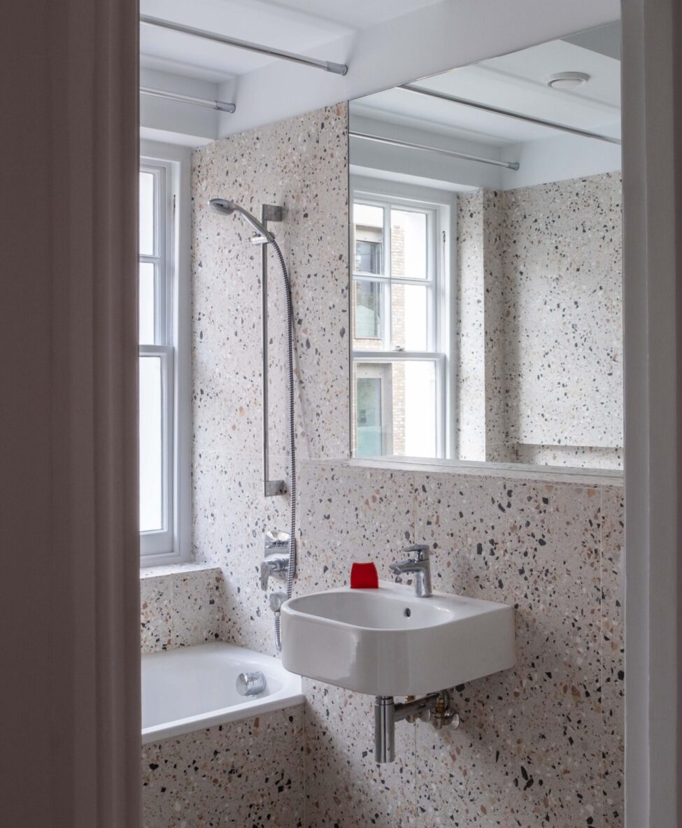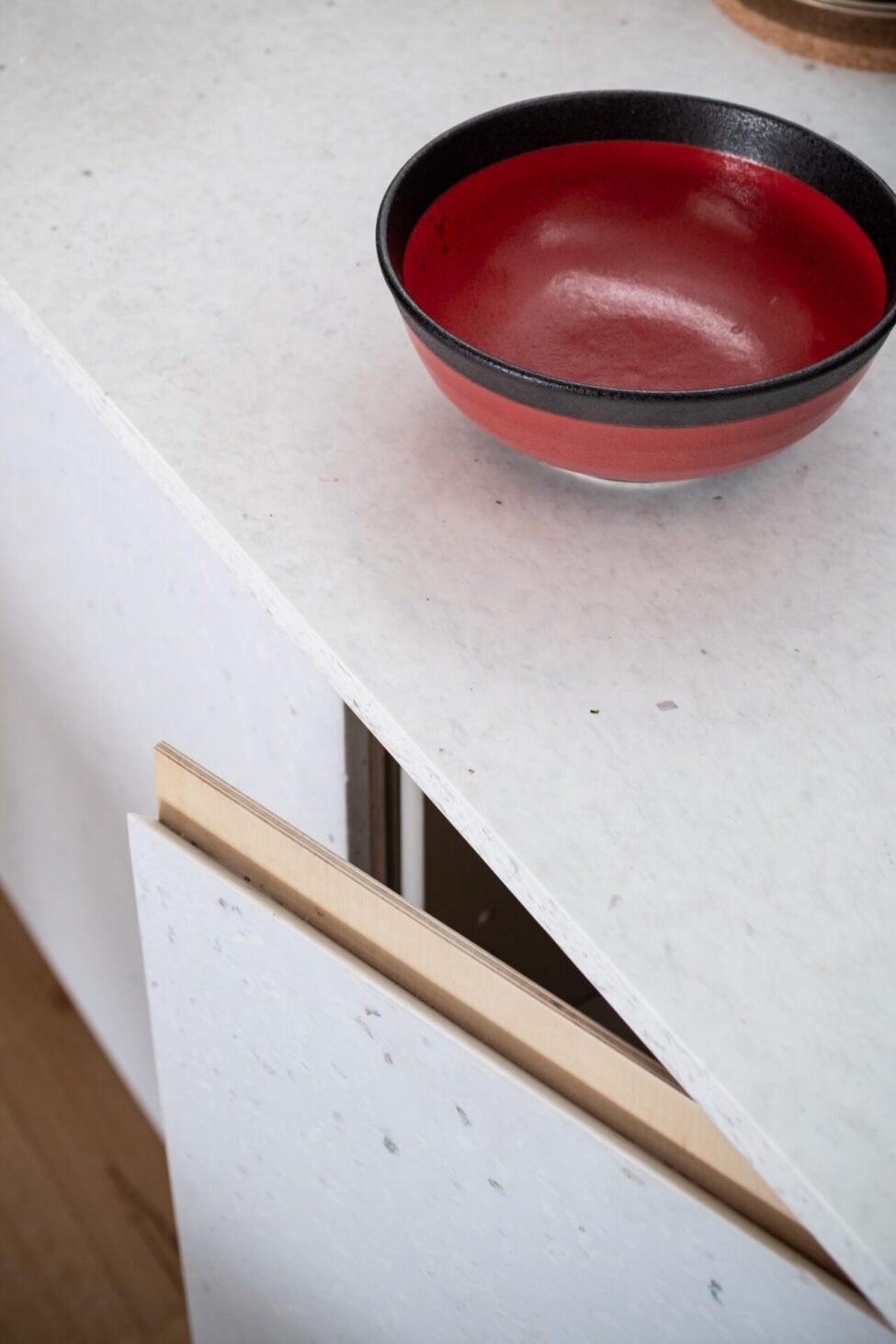 - a very simple palette of materials includes terrazzo tiling with 40% recycled porcelain and recycled yoghurt pot boards as kitchen units and worktops;
