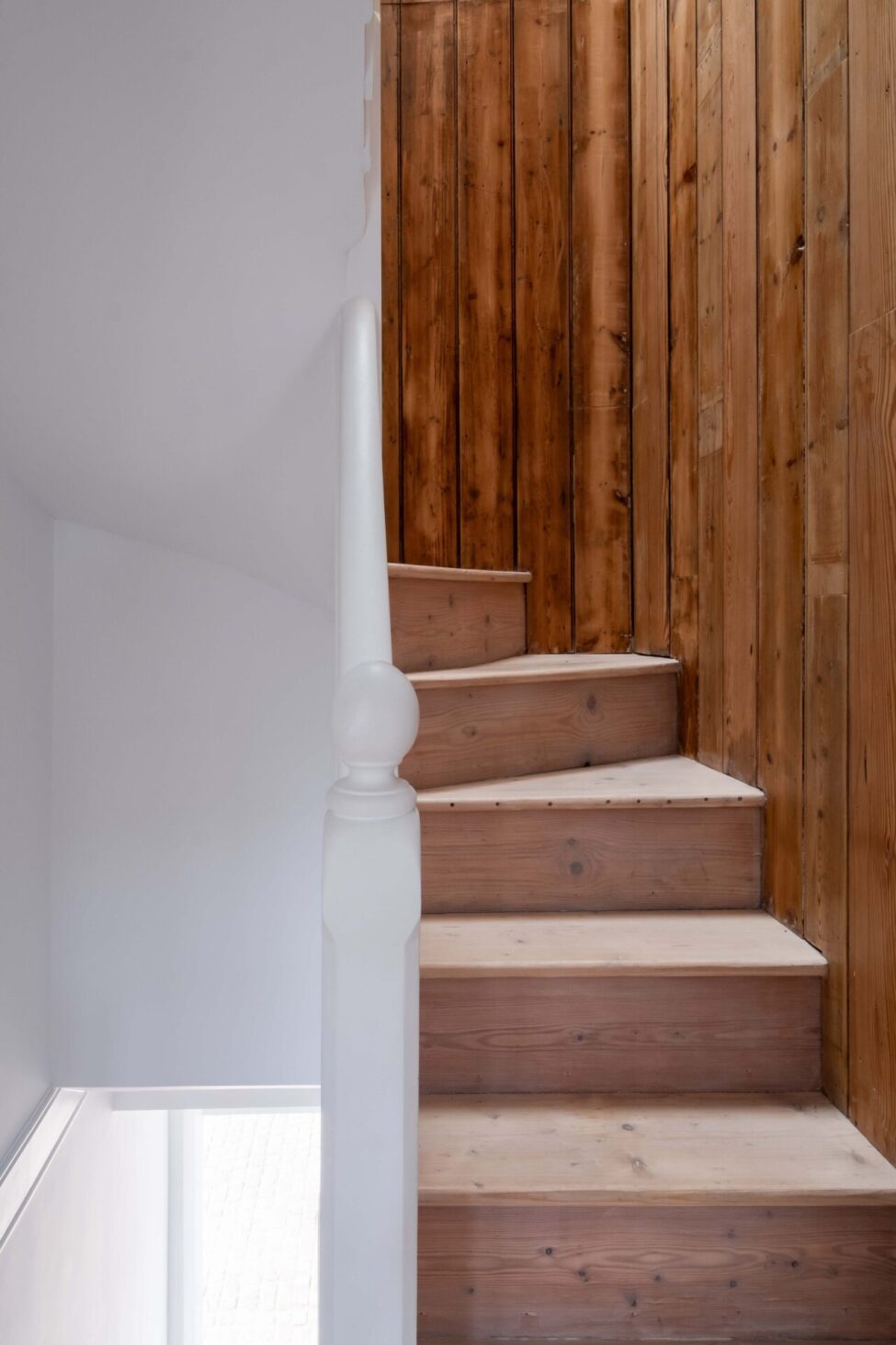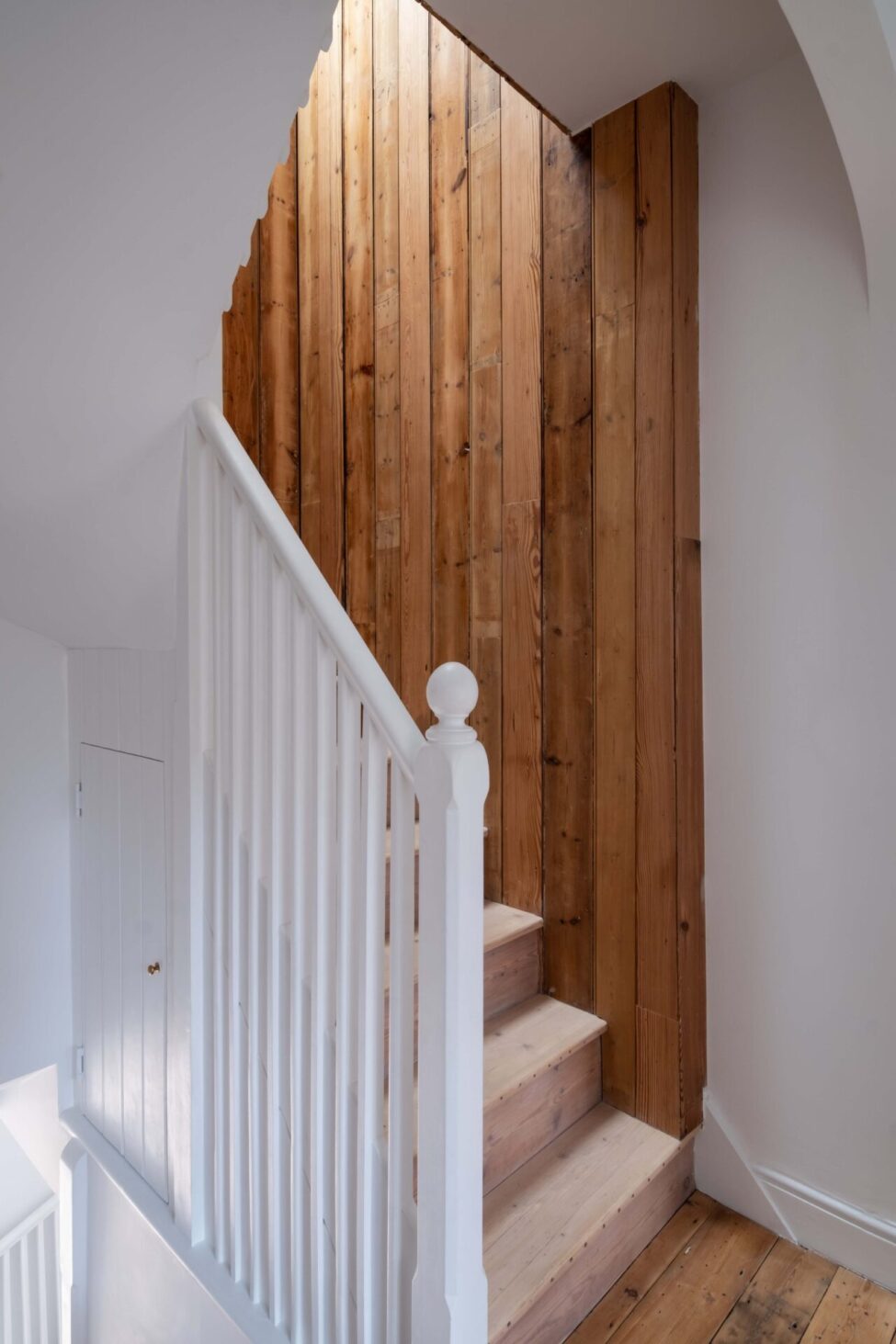 - timber boarding discovered within plasterboarded walls is installed as wall cladding around the old winder staircase leading to the loft;