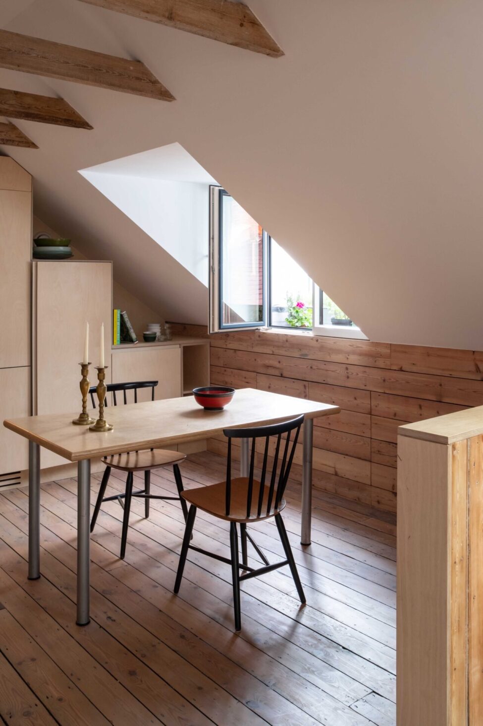 - the less good floorboards are turned 90º as cladding for the low loft walls;