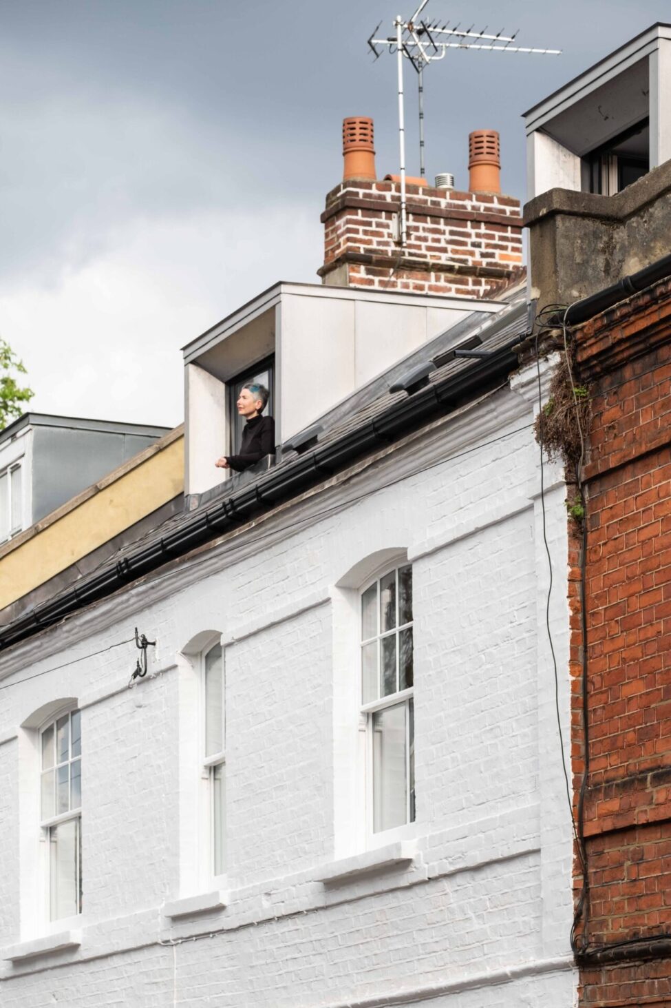 The building envelope is fully insulated and sealed with taped internal OSB and fitted with a whole-house MVHR system. The old brickwork is independently ventilated through the pointing weepholes. The open-plan boat-like cooking/living space on the top floor is roofed with reclaimed slates. On the roof, solar hot water panels are recessed into the southern pitch while a pair of heavily insulated, yet quietly modern dormers sit on the North-facing pitch. Though identical from the street, one dormer hides a full-height French door by the sitting area while the other, a smaller window with a herb garden by the kitchen. The openings are carefully calibrated to maximise light from the North and South.
