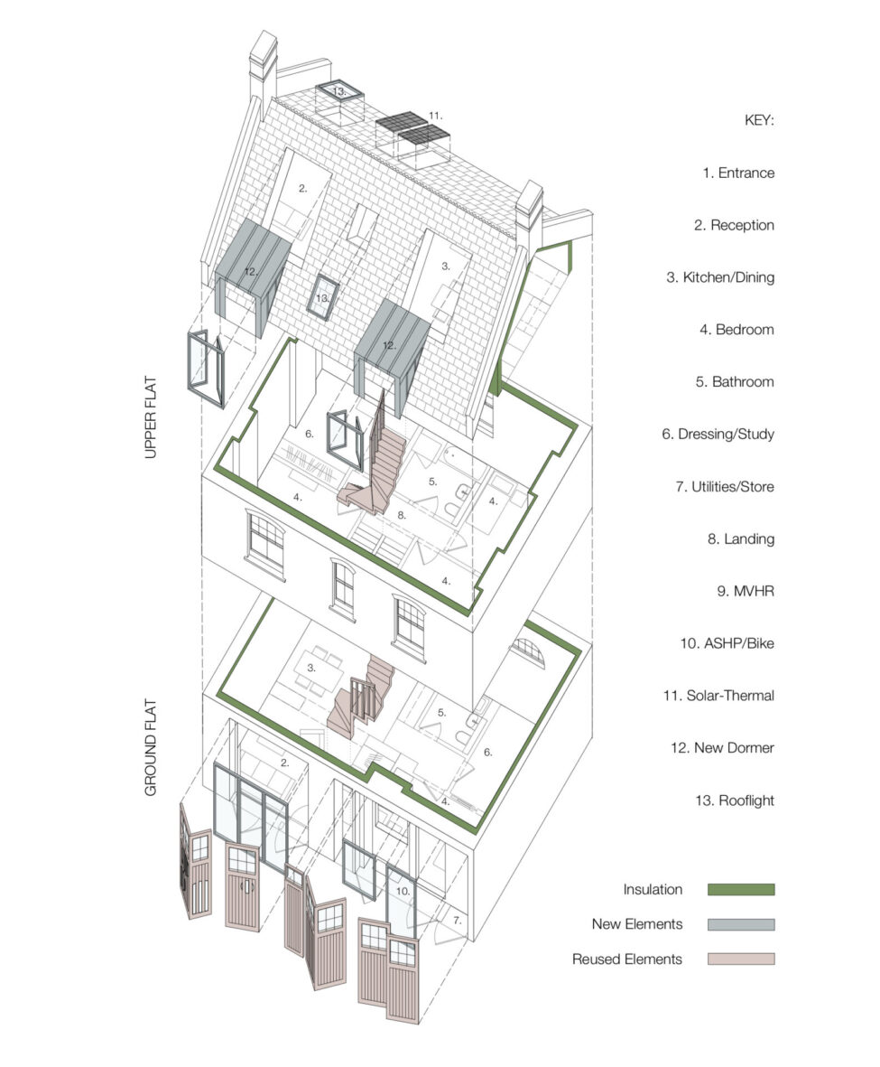 Originally Victorian stables with staff accommodation above, the mid-terrace mews building had been partially converted into a house in the 1980s. It included an un-insulated attic, an open garage-cum-store room on the ground floor and an extensive number of bathrooms throughout. The brief asked for an efficient, future-proofed, pair of self-contained homes with a break-through spot to inter-connect in the future. Above the 1-bed ground floor flat, the first occupants of the upside-down 4-bed maisonette are refugees fleeing conflict.