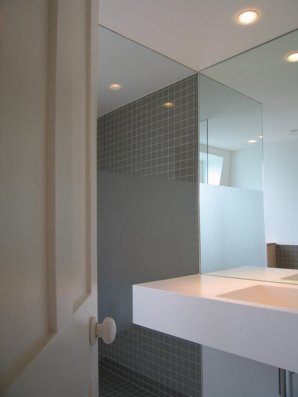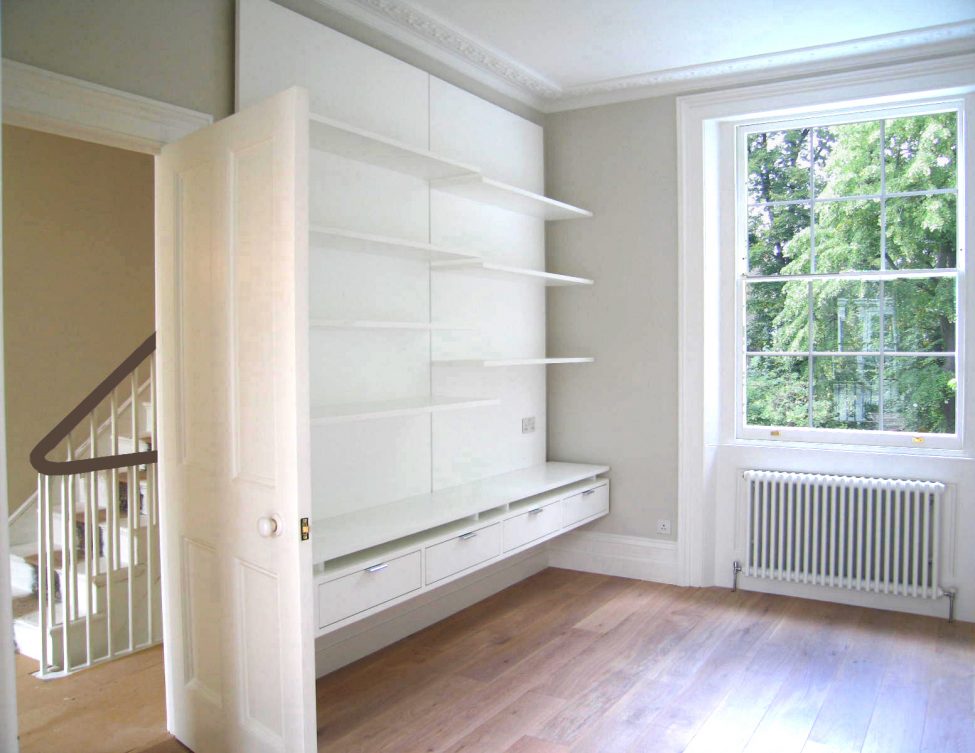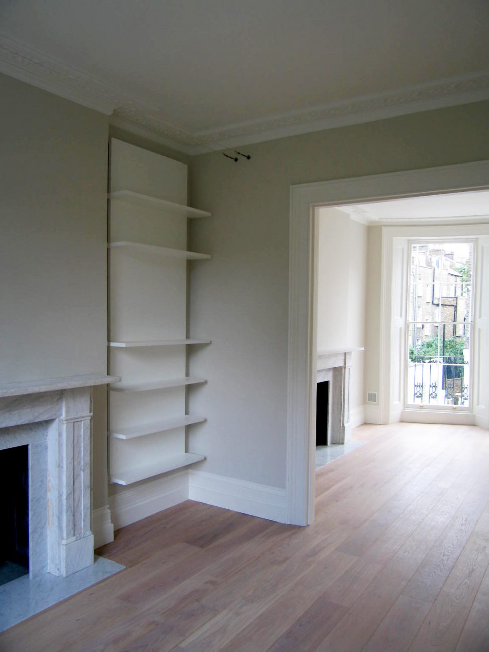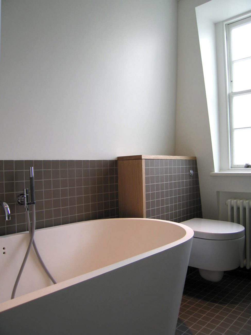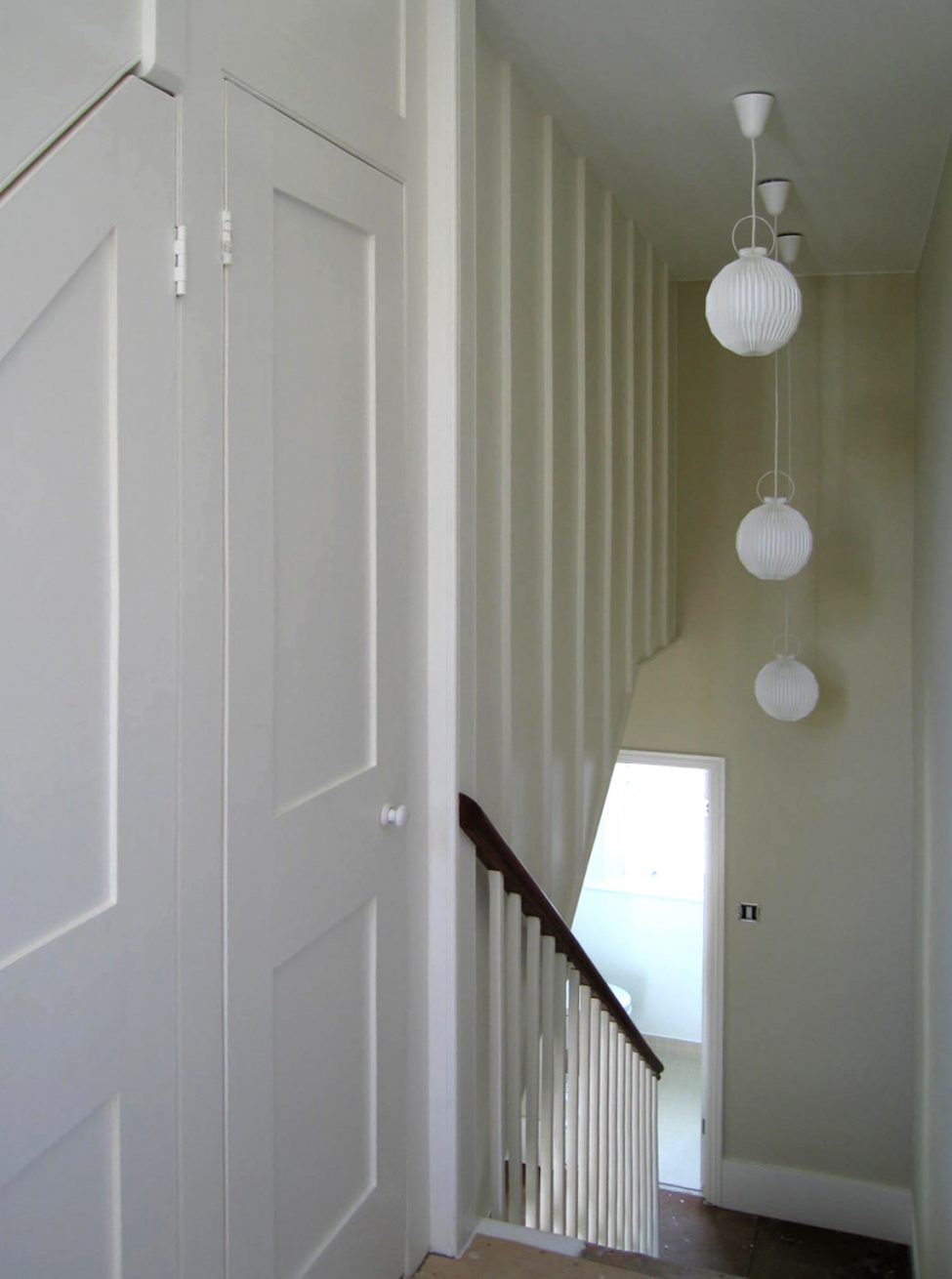 This building’s listing and the client’s budgetary constraints dictated only minimal changes to the internal structure. Instead, the existing cellular nature of the floor plans was reused, room uses relocated or reinvented, either separating or inter-connecting between them. The cellar became an independent apartment with own side entrance. The listed staircase was carefully clad-over with “giant clapboarding” to provide a new utility room and additional storage. In addition to historic materials such as lime plaster and distemper a palette of the contrasting, modern materials such as spray-painted MDF, rubber sheeting and cast recycled plastic was used internally. The colour palette was kept deliberately pale, serving as a back-drop and allowing the owners to add their own personal touches of colour and vibrancy.