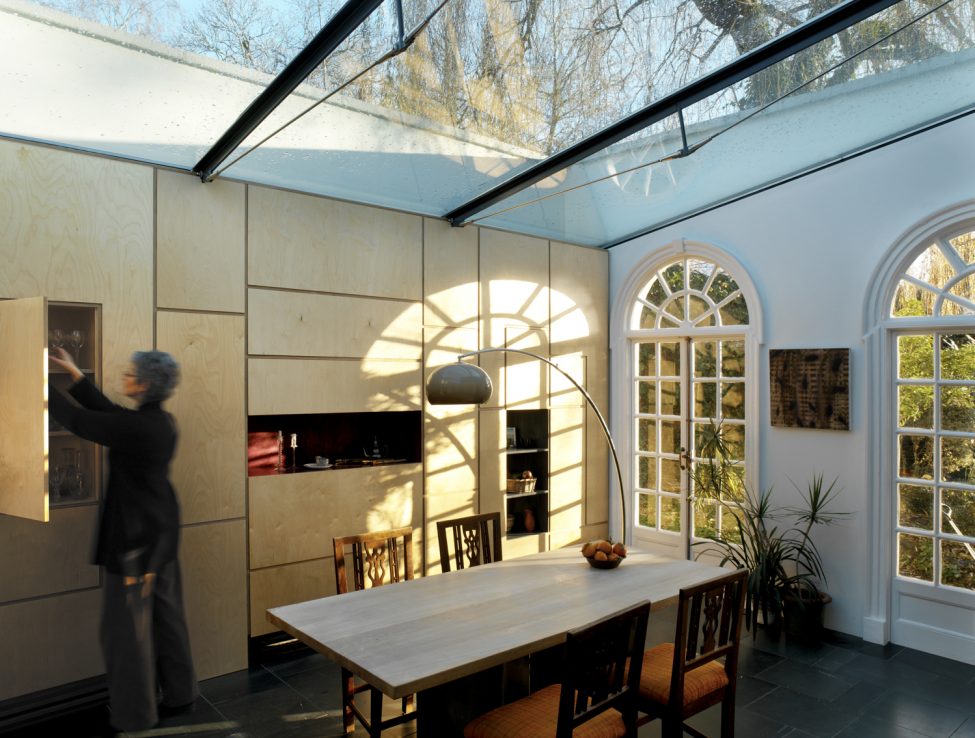 In terms of layout, the ground floor underwent the most extensive interior changes. The functions and flow between rooms were reconfigured, and the grim ‘Orangery’ striped out and opened up to the sky. With a new glass roof, and a combination of fixed and sliding ply and glass partitions, the ‘Orangery’ finally feels like the truthful bearer of its name.