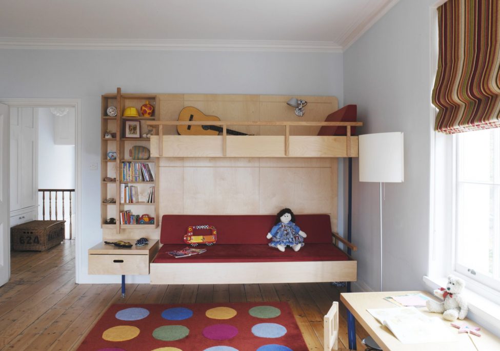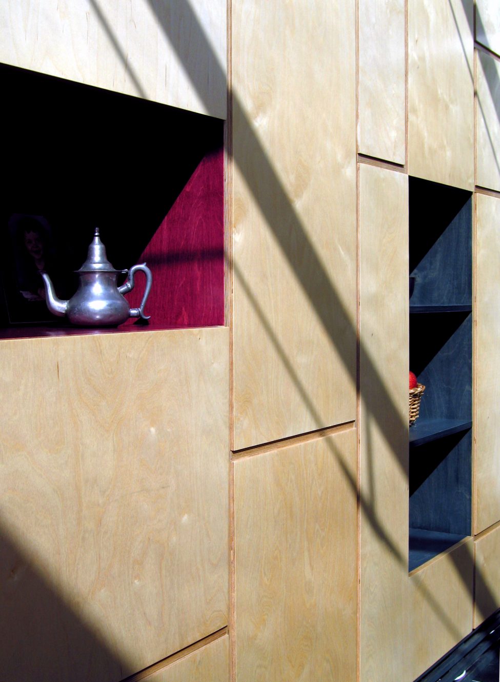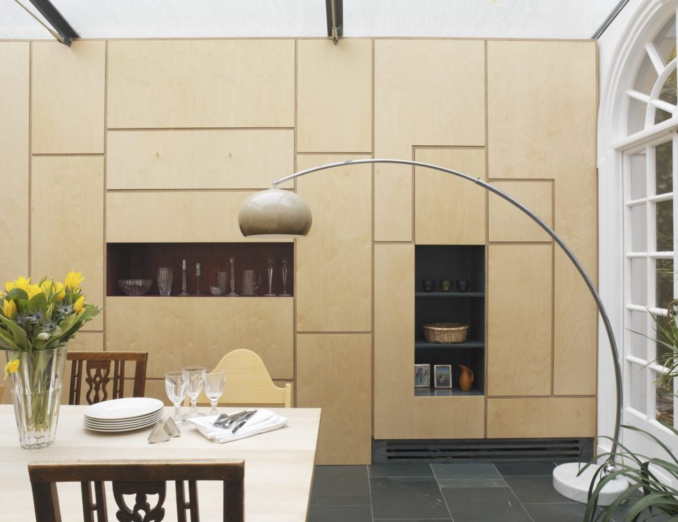 The entire house was refurbished and features built in ply joinery on every floor, simply varnished or colour stained. Birch ply was chosen as a modern, economical, & sustainable material to clearly juxtapose a contemporary layer to the existing Georgian features.