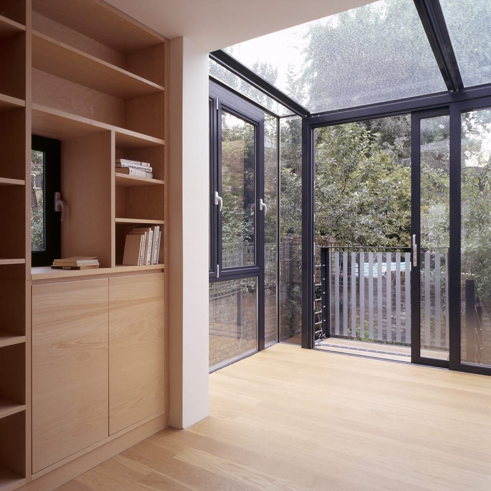 The inclusion of fire rated glazing into selected punctures meant that two floors could act as a single fire compartment. Hence there is unrestricted open plan living on both floors that complies with Building Regulations. For example there is an open plan kitchen-dining-study on lower ground, and interconnected front and rear receptions as well as a garden reading room on upper ground. The fully glazed reading room overlooks the garden, bringing the outdoors in.