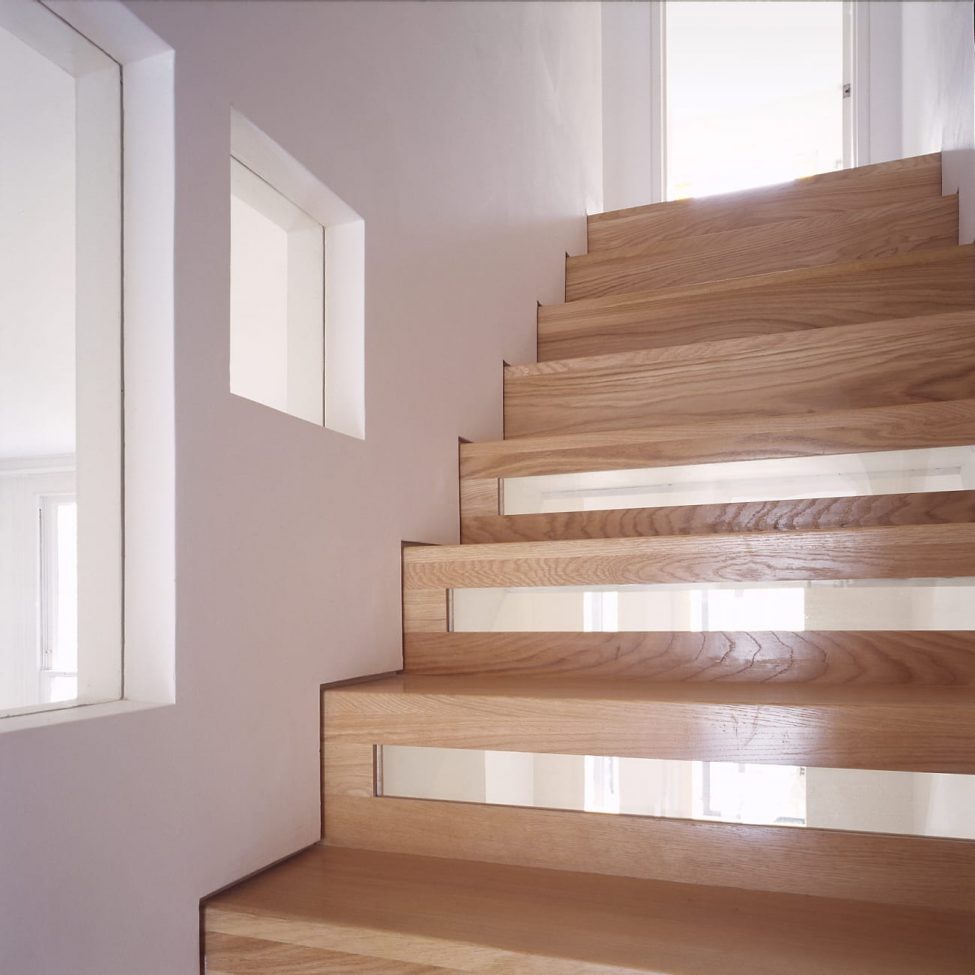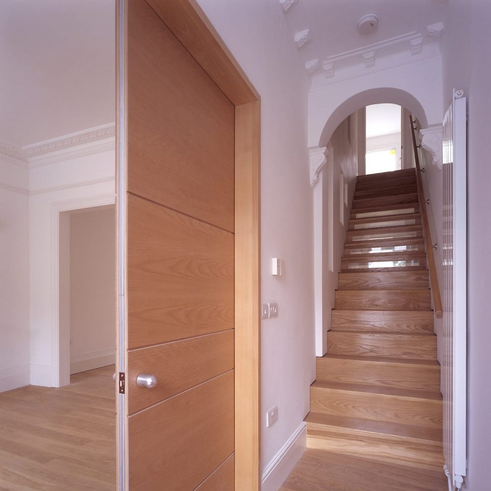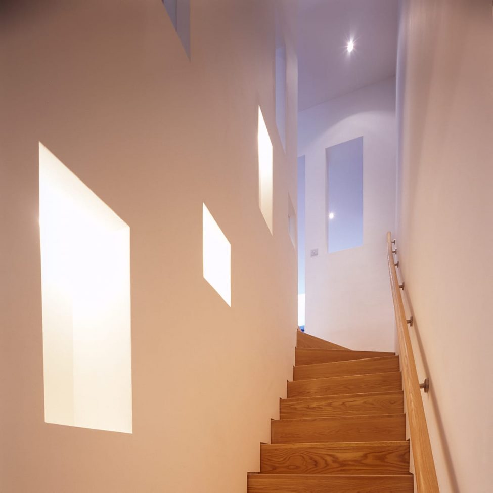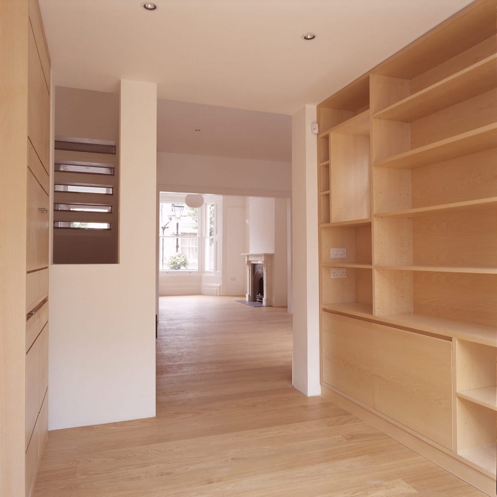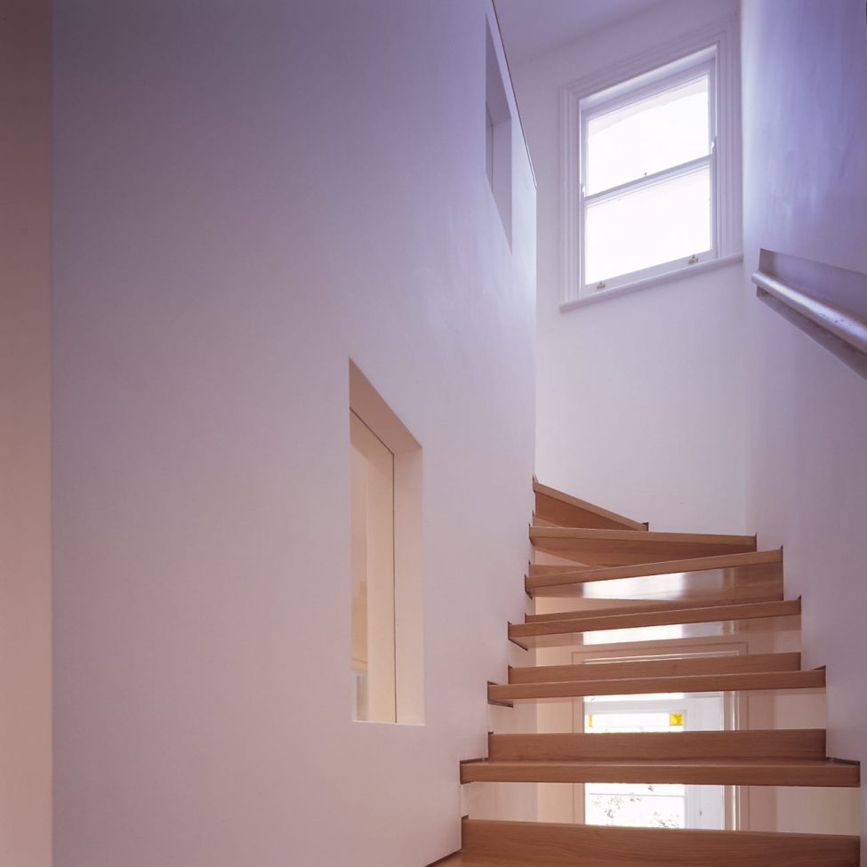 The internal circulation was reorganised by removing the existing staircases, which immediately increased habitable floor area and created direct garden access. A new single, three-storey straight stair was built between one party wall and a three-and-a-half-storey timber stud partition. This stairway has open or glazed ‘punctures’ that keep an otherwise narrow area awash with light and feeling spacious.